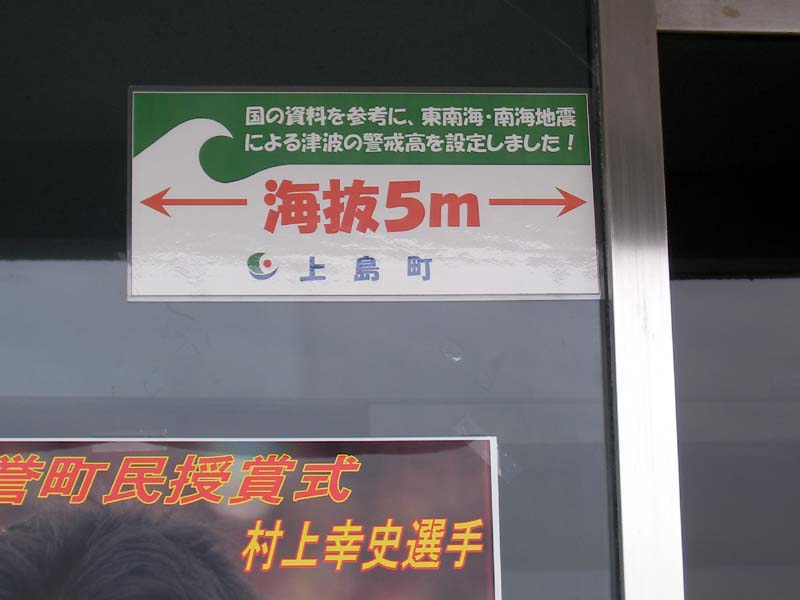 その村上選手のポスターの上には津波の警戒標識が。でも,瀬戸内海で5mも上昇するかなぁ・・・