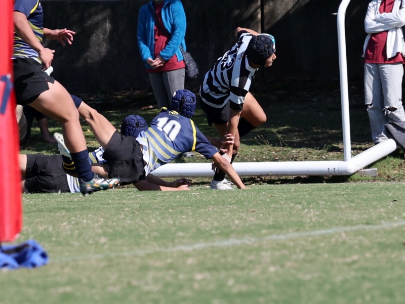 前半30分 スクラムから展開し,13番福積がトライ 徳永がゴールを決めて12-7でハーフタイム