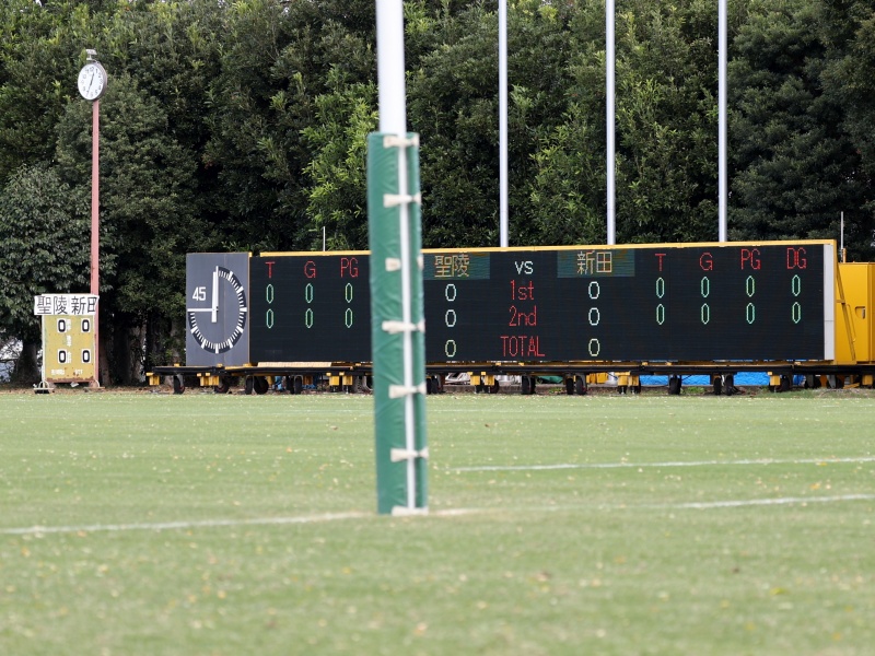 先週システムダウンした電光掲示板。業者に来てもらって修繕したようで,復活。以前の「トライ!」,「ゴール!」という表示をやめてシンプル化して,シムテムへの負荷を低減したようでした。今日はトラブルなく,無事に終了しました。高体連専門部は,トラブルにそなえてアナログ掲示板(写真左端)を用意していましたが,出番なし。よかった。