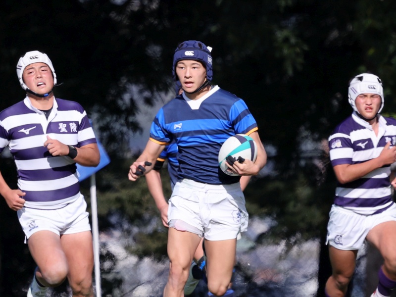 新田11番福本がスクラムサイドを抜け出してビッグゲインしましたがトライまではいかず