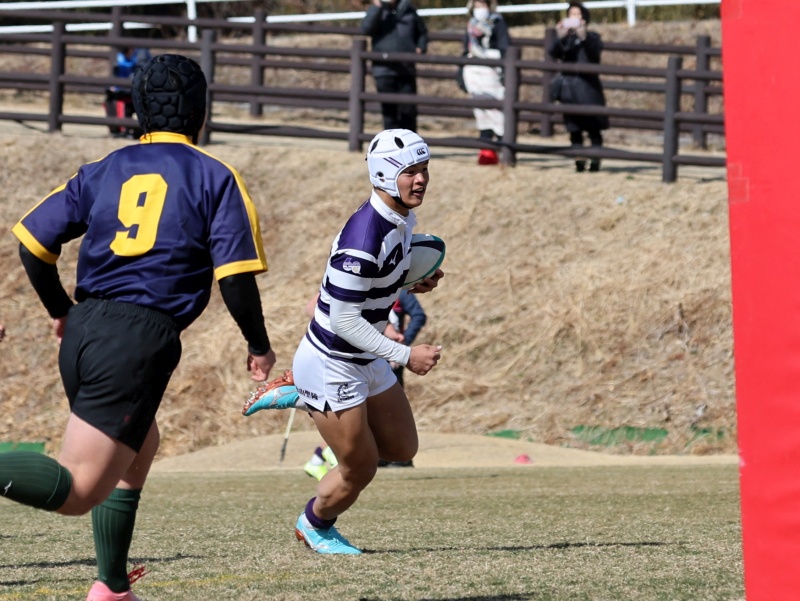 前半11分 聖陵FWがトライラインにせまったあと,左に展開し,阿塚がトライ。14-0