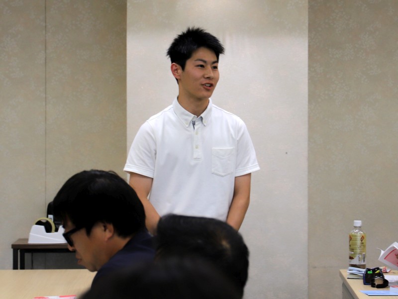 その後,新任の県協会理事(重見さん,辻さん,辻井さん,黒田さん,小川さん)の挨拶のあと,新チームの代表者の挨拶。写真は岡山文理大今治校の方(大阪の高校卒とのこと)。この他,住友化学から大石工作所に名称変更した大石工作所の方も挨拶。